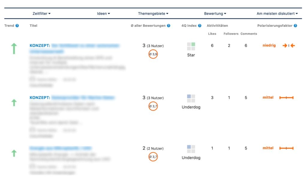 Auf der Open Innovation Platform können Sie die Entstehung von Ideen in Echtzeit mitverfolgen: Für welche Themen gibt es die meisten Ideen? Welche Ideen werden am heißesten diskutiert. Zu welchen Ideen gehen die Meinungen gar nicht oder sehr stark auseinander (Polarisierungsfaktor)?